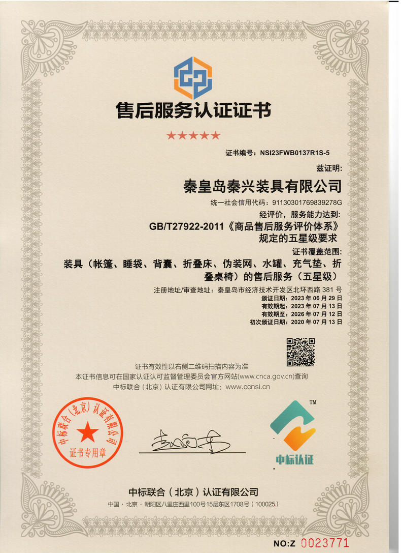 • 售后服務認證證書